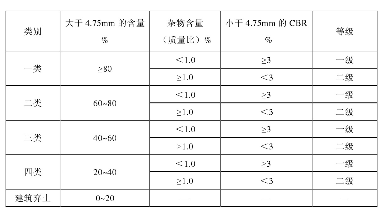 當(dāng)對建筑垃圾進(jìn)行加工利用時,由于不同位置堆放的建筑垃圾的組成成分的差異性較大,這就要求我們必須在利用前對其采取一定的分類措施。首先應(yīng)根據(jù)建筑垃圾的初步分類標(biāo)準(zhǔn)來確定哪些為可利用建筑垃圾,而哪些又為能不利用的建筑垃圾。即根據(jù)建筑垃圾中 4.75mm 以上顆粒含量的不同、雜物含量以及 4.75mm 以下細(xì)料的力學(xué)強(qiáng)度等指標(biāo),對建筑垃圾進(jìn)行可利用建筑垃圾和建筑棄土的區(qū)分。然后按照上述指標(biāo)又將可利用建筑垃圾分為四個類別,每個類別包括兩個級別,具體的建筑垃圾分類標(biāo)準(zhǔn)與方法如圖所示。對于路基工程能不利用的建筑棄土,則將其就近回歸田地或?qū)⑵渥鳛榫G化用素土。